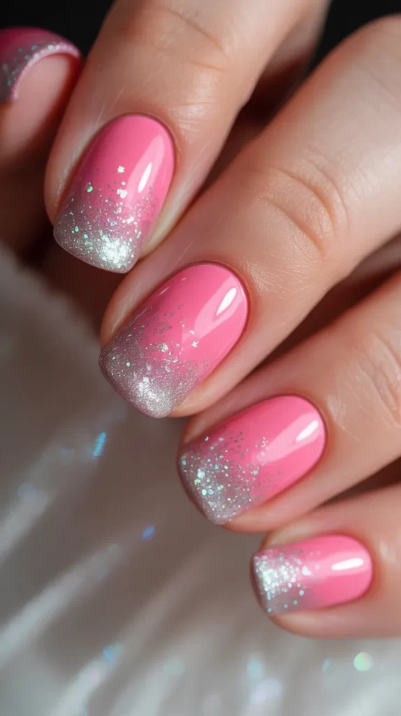 Use Barbie pink at the base and gradually fade into chunky or micro pink/silver glitter at the tips. The glitter should build up more at the tip and softly fade toward the middle, leaving the base more solid pink. This creates a glowing, twinkling effect as your nails catch light.