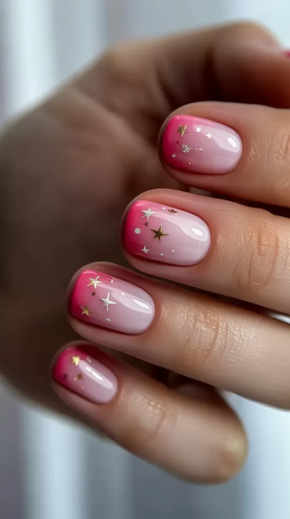 On shorter nails, this style works fabulously because the fade is visible without needing a long nail. You can also experiment with having the darker pink closer to the tip instead of at the base for a reverse ombré look. The stars add just the right festive tone without cluttering the nails.
