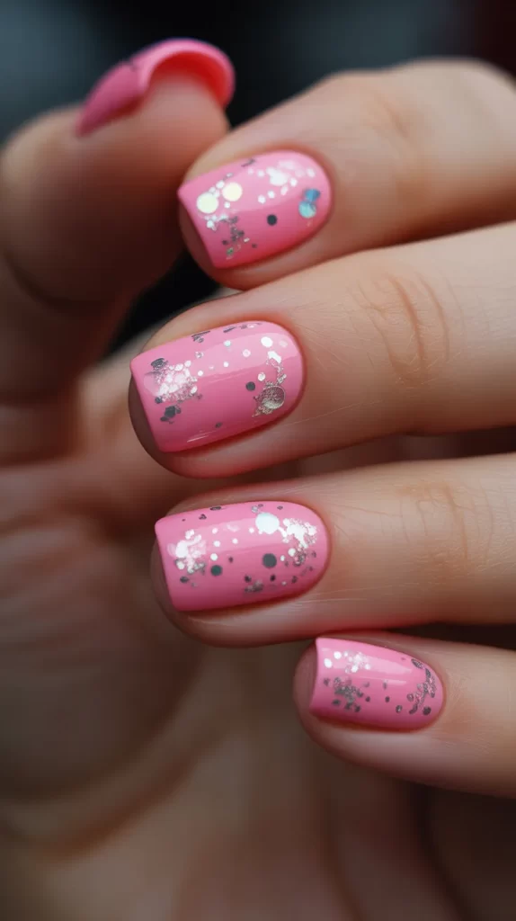 Choose a satin-finish Barbie pink (somewhere between matte and glossy—soft sheen). Over this base, add scattered glitter confetti bits (small circles, hexes, stars) in silver, holographic, or iridescent shades. The confetti should be sparse but visible so it feels festive without overwhelming. The satin finish makes the glitter stand out more softly.