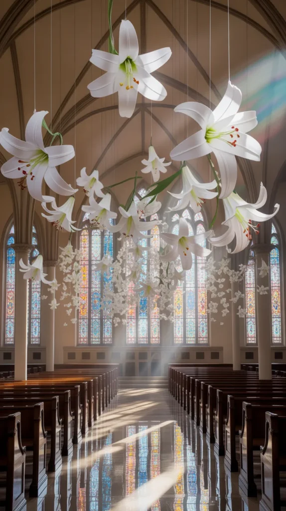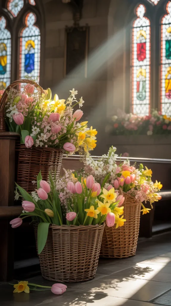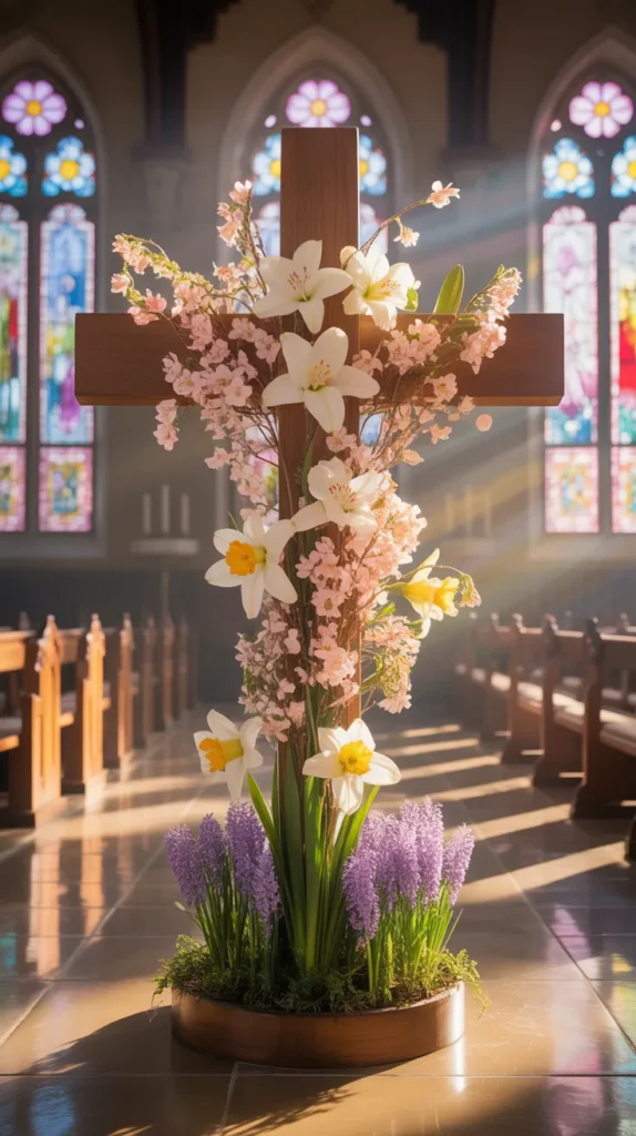A floral cross is one of the most powerful Easter church decorations. Start with a wooden or wire cross frame and fill it with fresh or faux flowers in soft spring colors like white, blush, lavender, and yellow. Place it near the altar or entrance so everyone sees it right away.