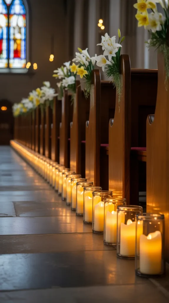 Line the aisle with LED candles in glass holders for a soft glow. This creates a peaceful mood for Easter services and special prayers.
