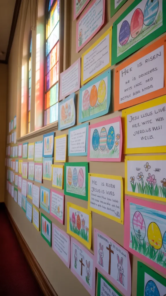 Dedicate one wall to children’s Easter drawings and Bible verses. This adds heart and personality while keeping decorating costs near zero.