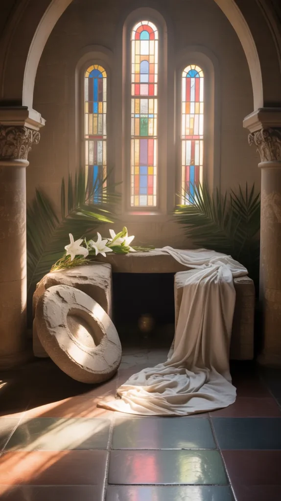 Create a small resurrection display near the church entrance using a simple tomb setup, stones, and white cloth. This visual tells the Easter story in a gentle, welcoming way.