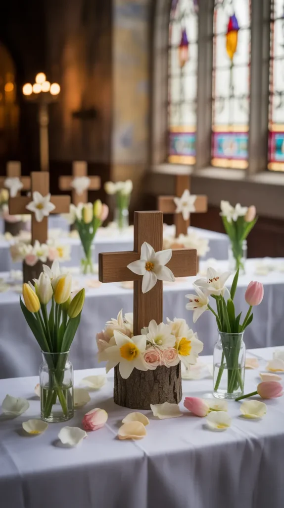 Place small wooden or floral crosses on side tables, offering stations, or fellowship areas. These tiny details bring unity to your Easter theme.
