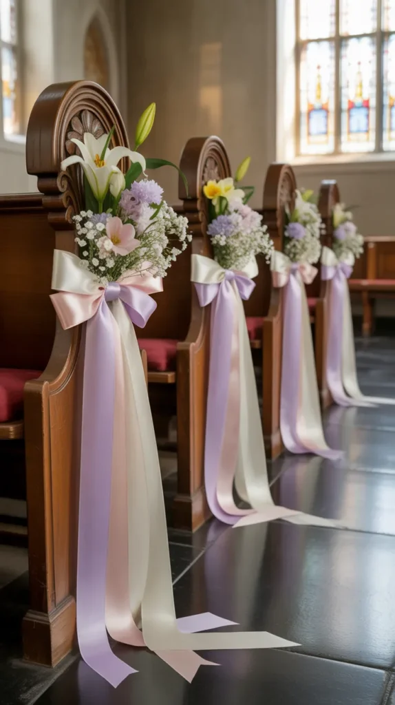Decorate aisle pews with small floral bows tied using ribbon and greenery. This adds charm without overwhelming the space and guides guests toward the altar.
