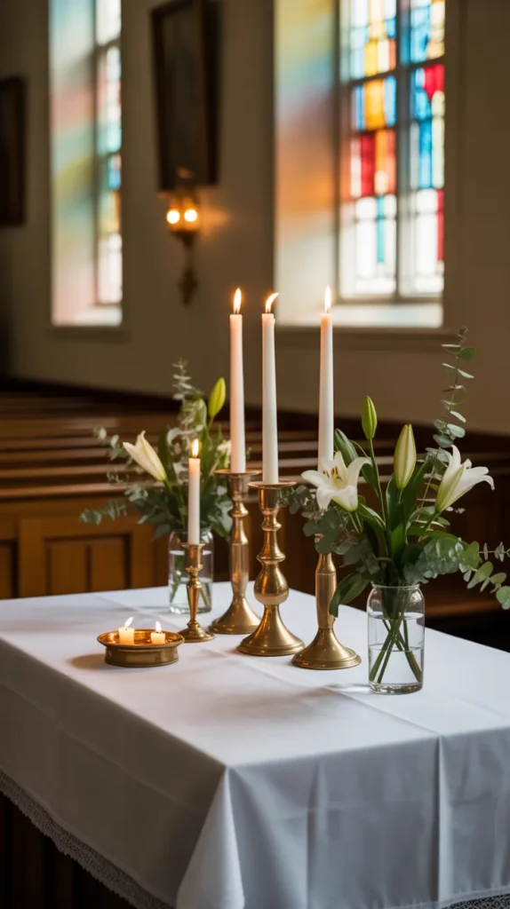 Decorate the communion table with white linens, greenery, and a few candles. Keep it minimal to honor the sacred moment.