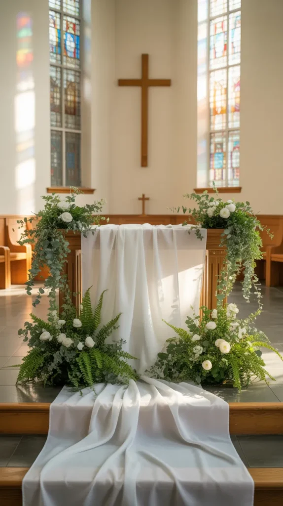 White fabric draped across the altar symbolizes purity and resurrection. Use lightweight curtains or table runners to create flowing layers. This simple change instantly brightens your worship space and works beautifully with candles or floral accents.