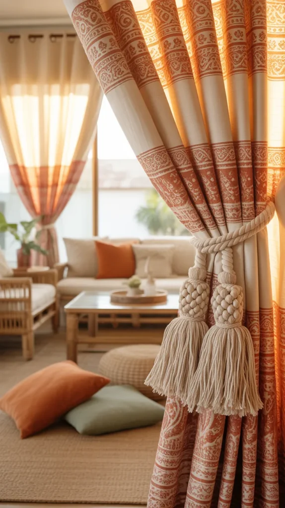 Boho-style tassel tiebacks with fringe details add a relaxed and artistic touch. They work well with patterned curtains and earthy color palettes.