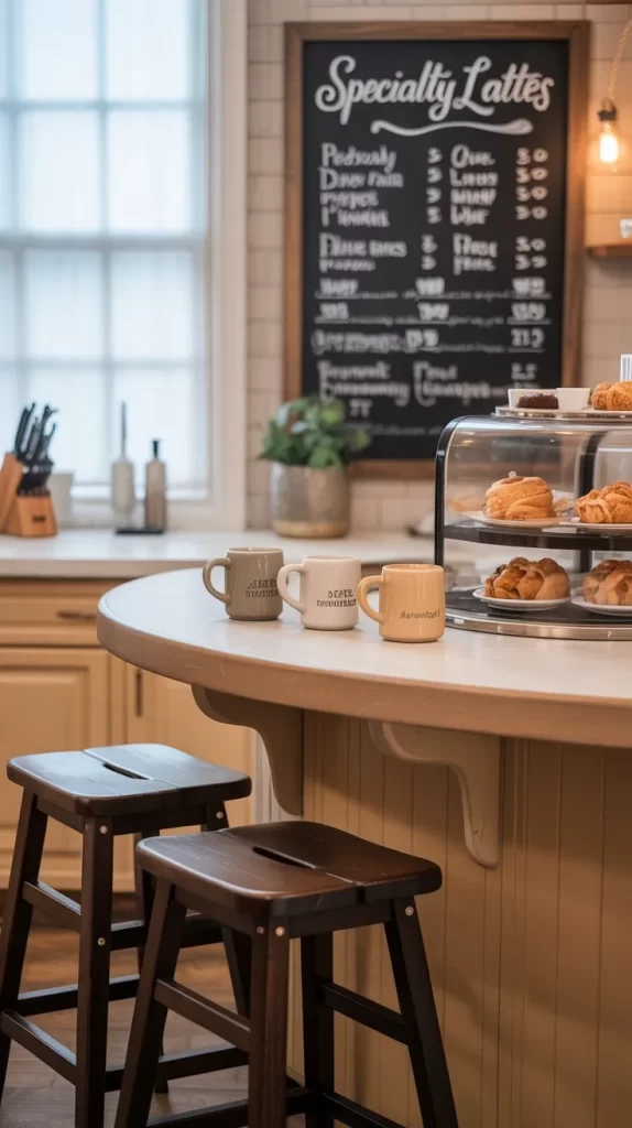 - Add a side counter with a coffee machine, shelves, and bakery decor.