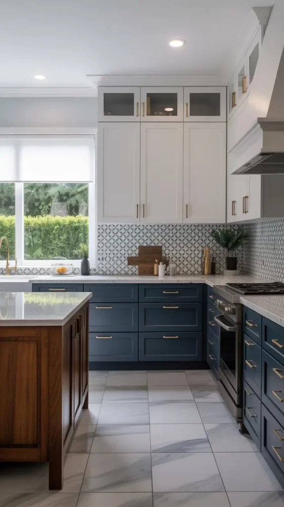 - Use white cabinets on top and dark gray or navy ones on the bottom.