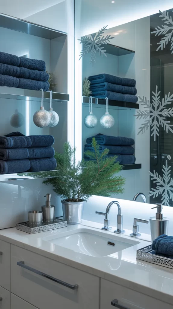Don’t forget your bathroom! Add blue towels, frosted soap dispensers, and silver accessories for a touch of festive charm.