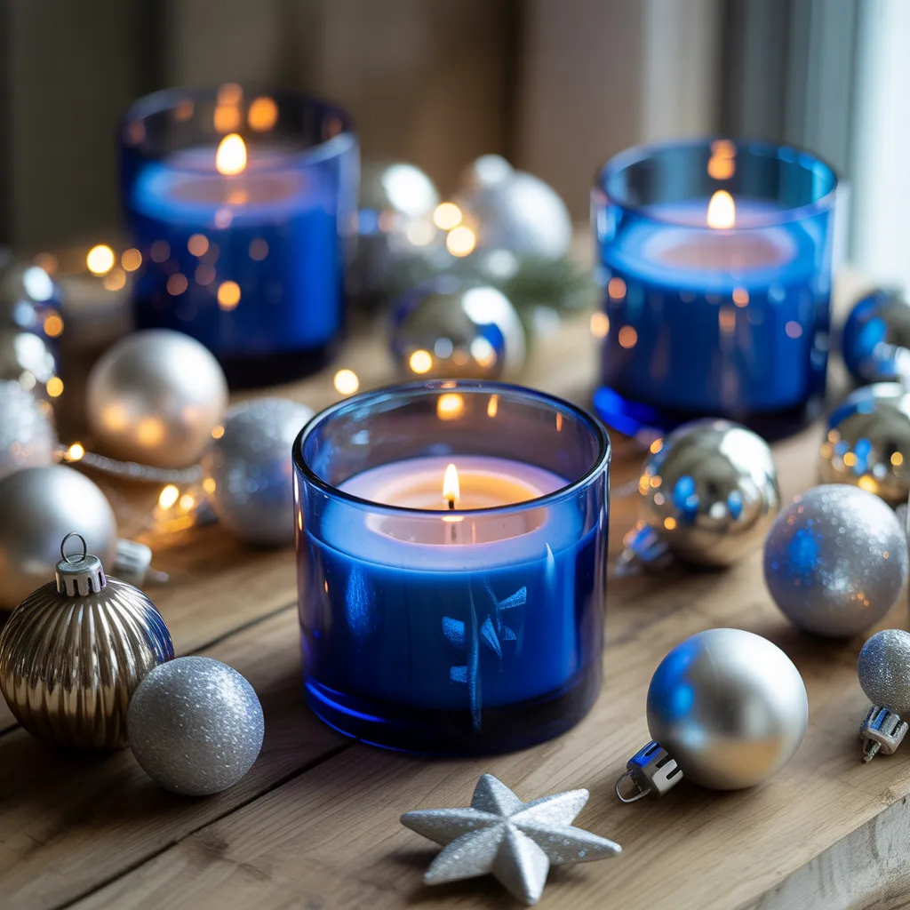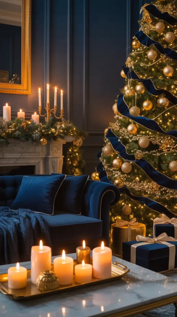 Use navy ribbons, gold baubles, and candles to style your tree or dining table. This pairing brings warmth and elegance to your winter decor.