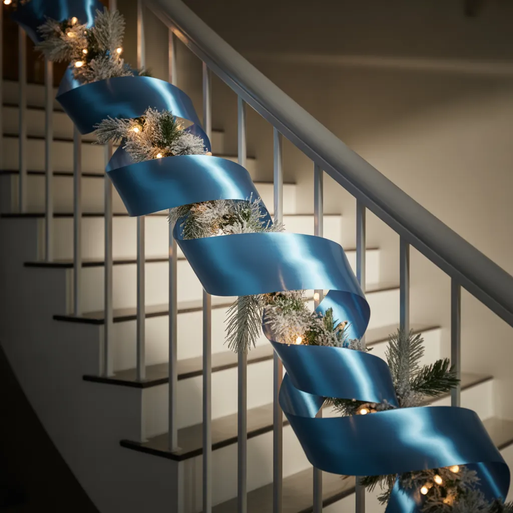 Drape blue satin ribbons along your staircase, windows, or tree. Pair them with white or silver garlands to add a layered, textured look.