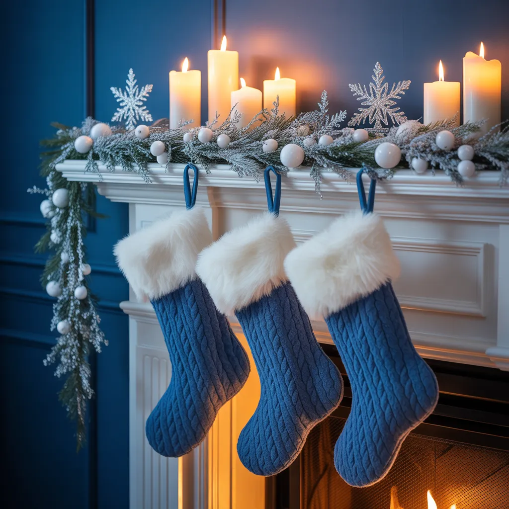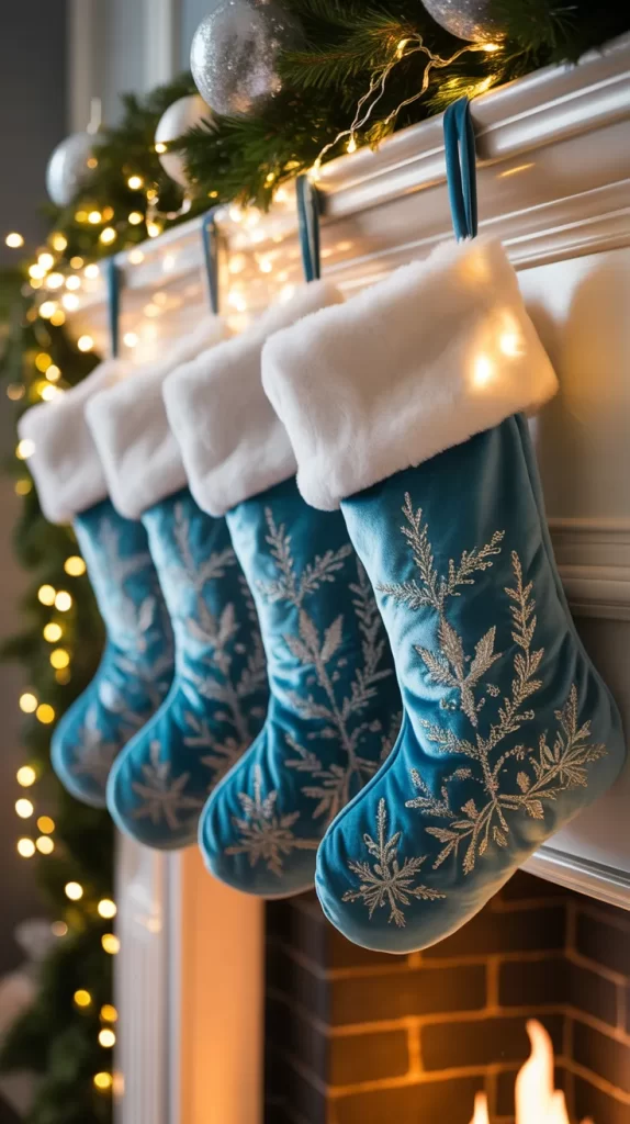 Turn your fireplace into a snowflake wonderland using shades of blue and white. Hang blue stockings, white garlands, and silver snowflake ornaments for a cohesive look.