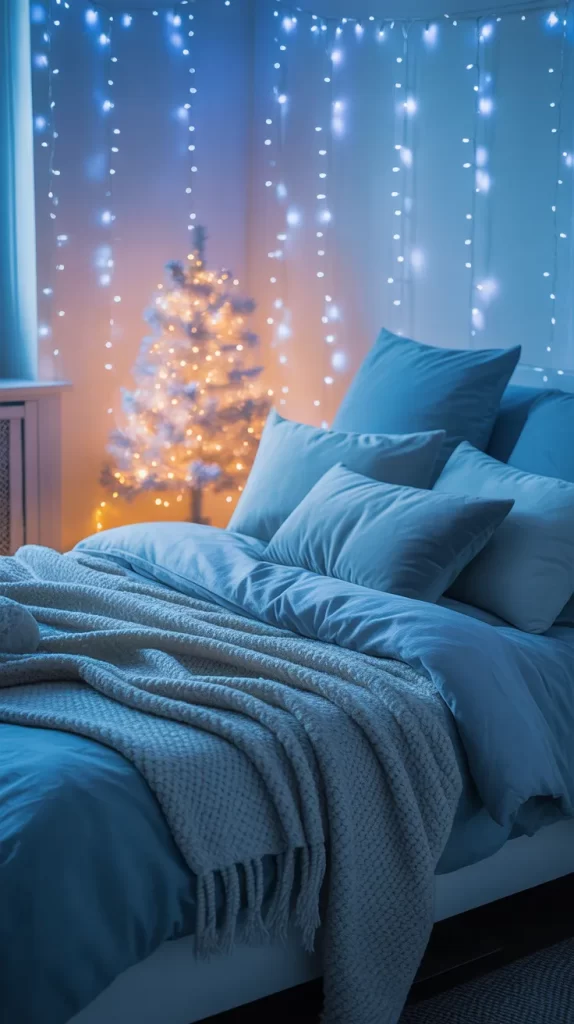 Make your bedroom cozy and festive with blue fairy lights around the headboard and soft blue bedding. Add a mini white Christmas tree by the window.