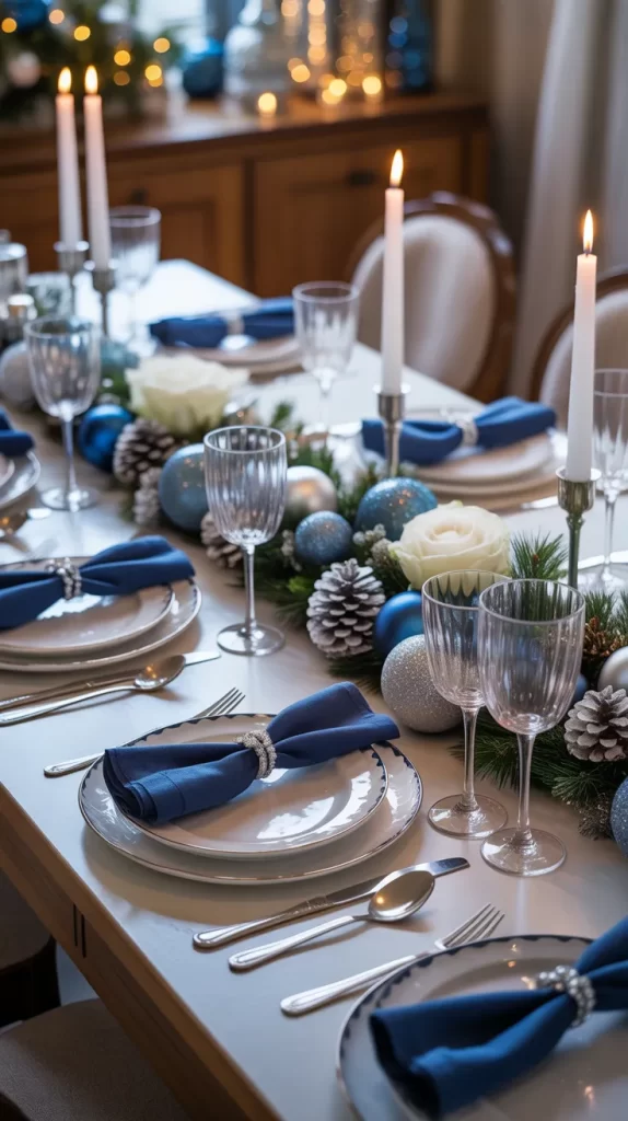 Set a blue and white Christmas table that feels straight out of a fairy tale. Use white tablecloths, blue napkins, and silver tableware for a clean, elegant touch.