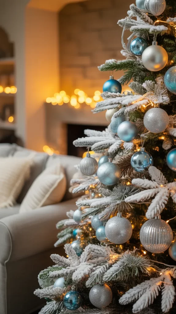 A frosted blue Christmas tree instantly captures the icy beauty of winter. Choose a tree with snow-dusted branches and decorate it with shimmering blue and silver ornaments.