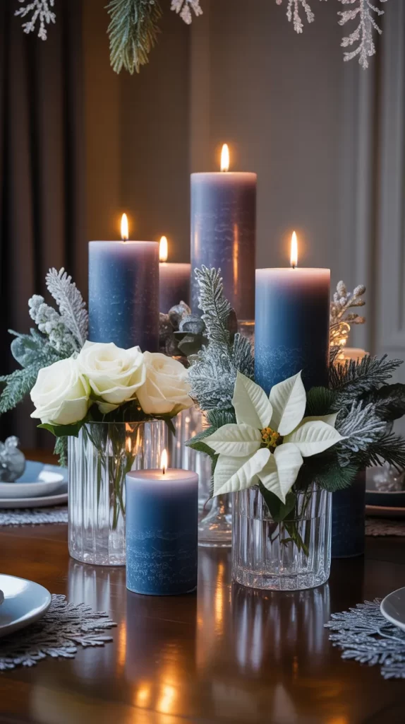 Create a table centerpiece using crystal vases, blue candles, and frosted branches. Add white roses or hydrangeas for softness.