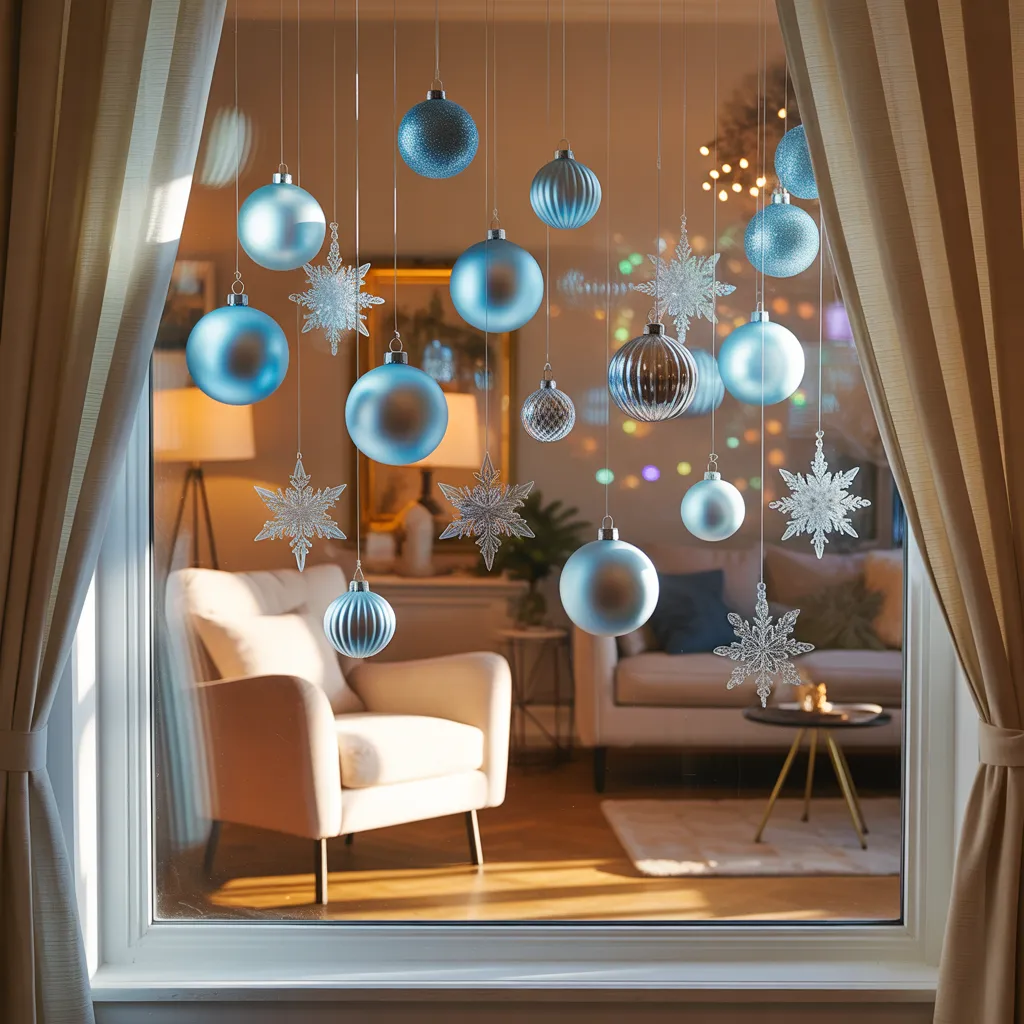 Hang blue and silver ornaments in your windows to catch sunlight during the day and sparkle at night.