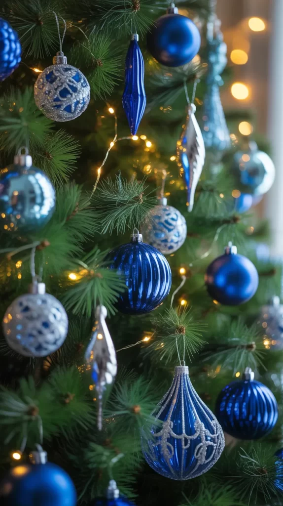 Combine sapphire blue and silver ornaments for a timeless, sparkling effect. These colors complement any tree, whether green or white.
