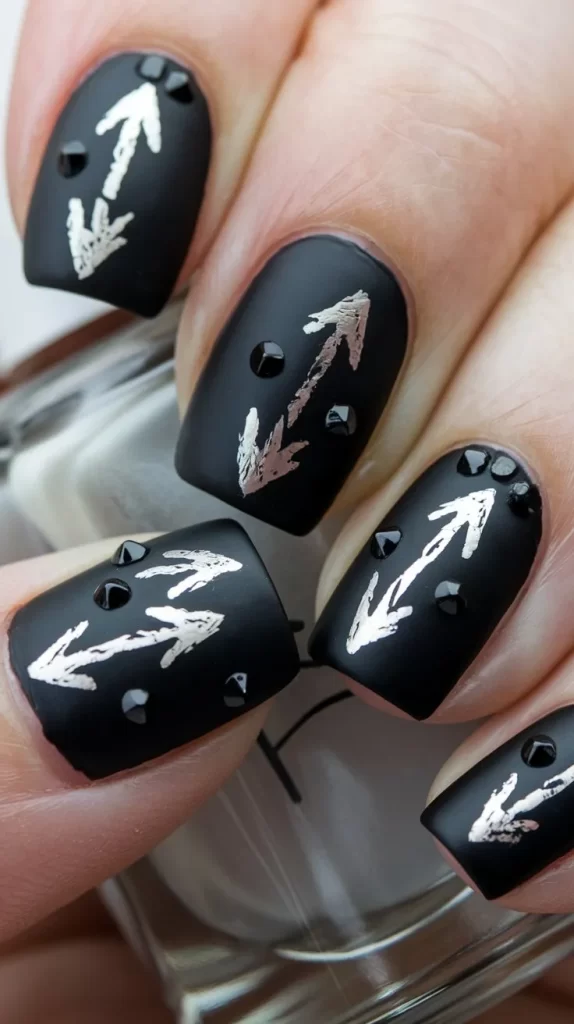 - Use a fine nail art brush to draw arrow shapes in metallic or contrasting colors.