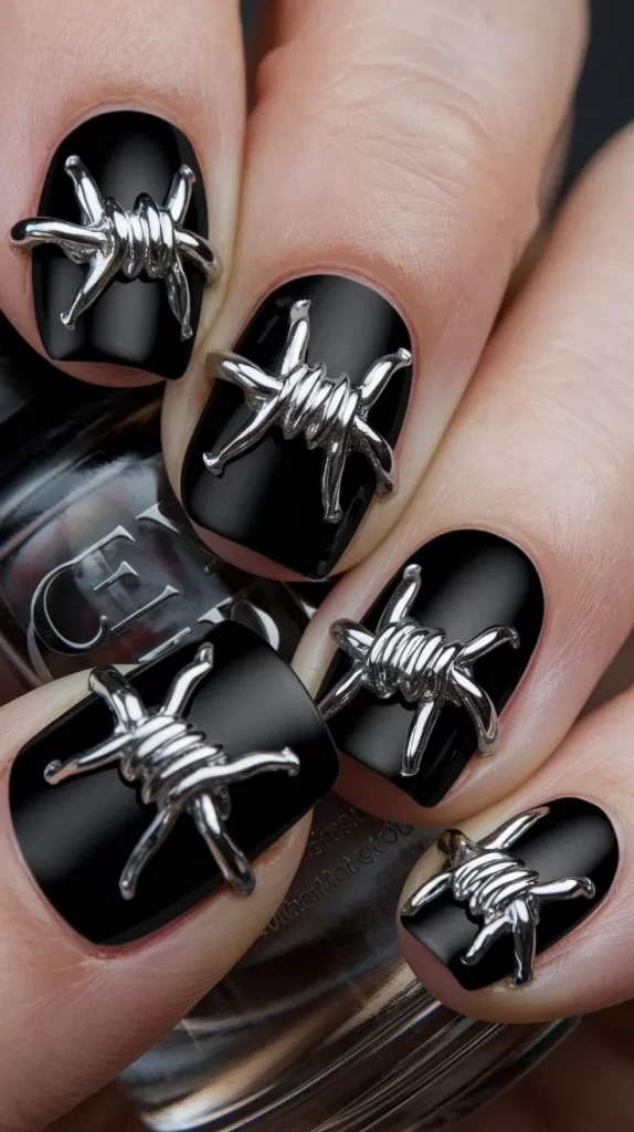 Barbed wire nails are the perfect anti-romantic statement. Combine sleek metallics with a dark base for a fierce and striking look.