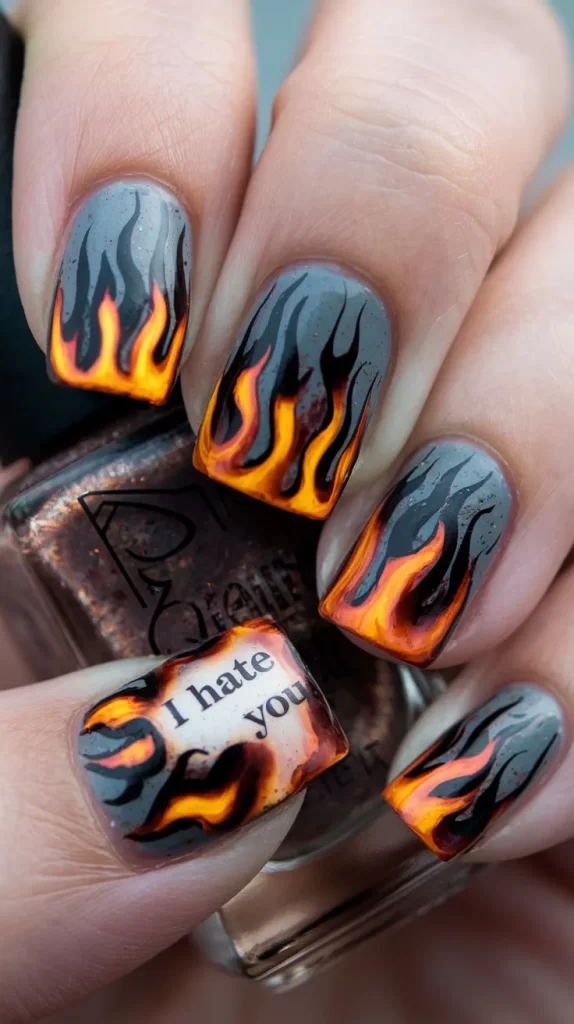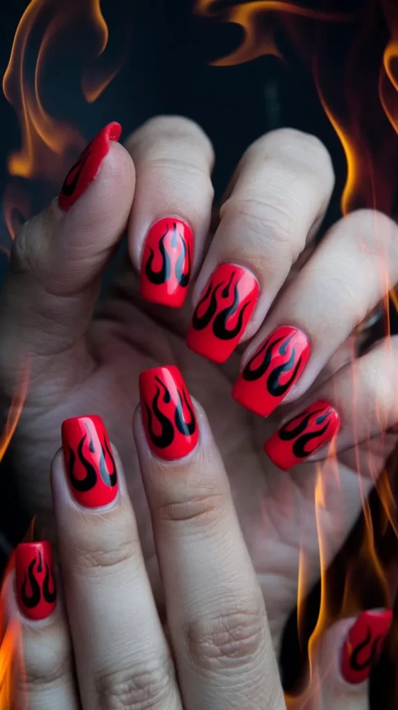 - Add small flame designs in red, orange, and yellow on one or two accent nails.