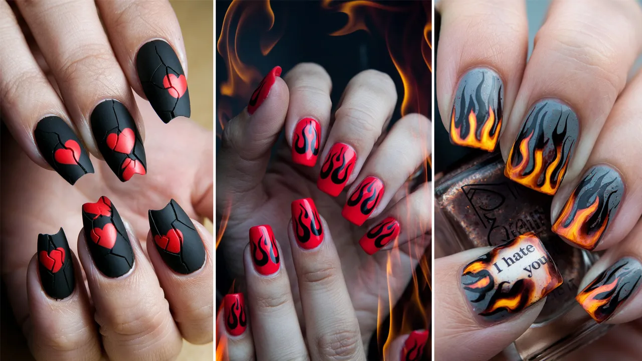 Express your disdain for clichés with nails that look like burning love letters, charred and fierce.