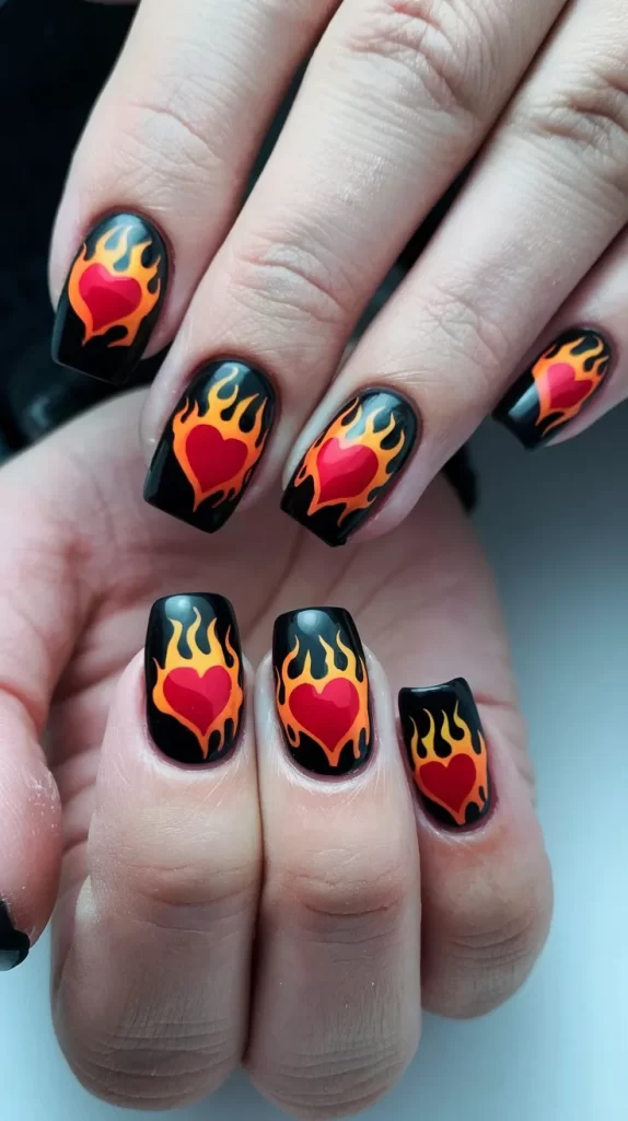 - Pair flaming hearts with glitter accents for an extra bold look.