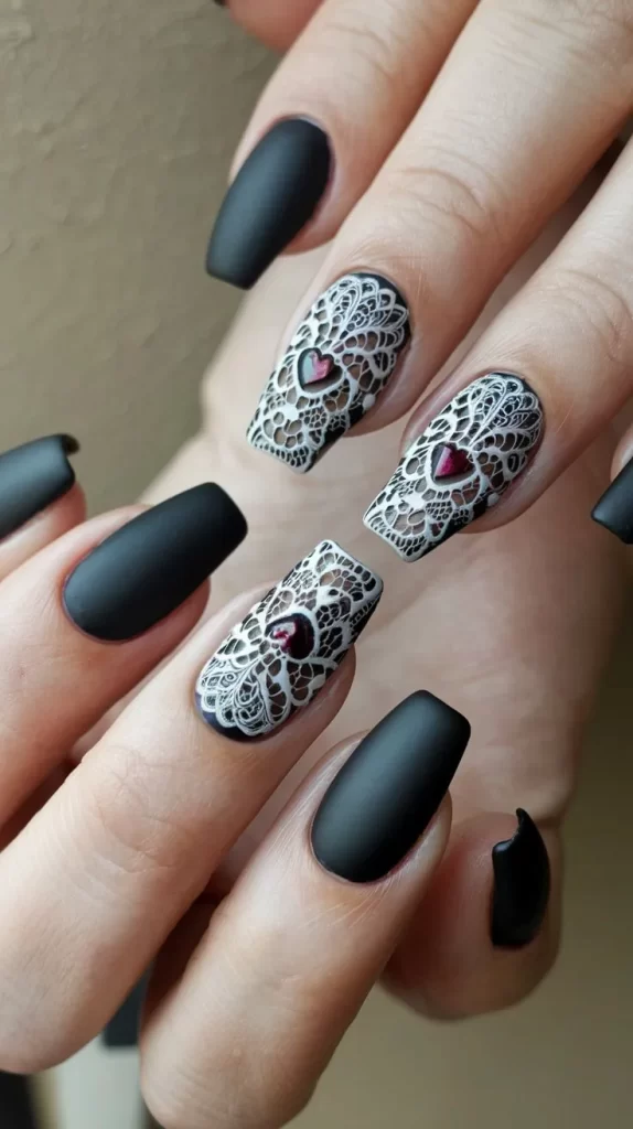 Lace-inspired designs in dark colors add a sophisticated, Gothic touch to your anti-Valentine’s look.