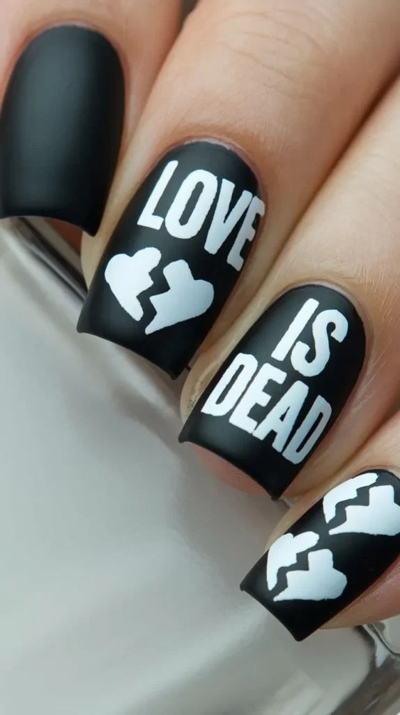 Showcase your dark humor with “Love is Dead” typography on bold black or gray nails.