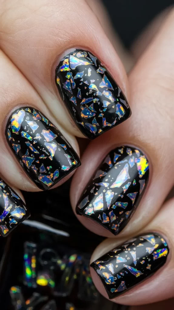 Shattered glass nails symbolize broken illusions, offering a reflective and edgy anti-Valentine’s vibe.