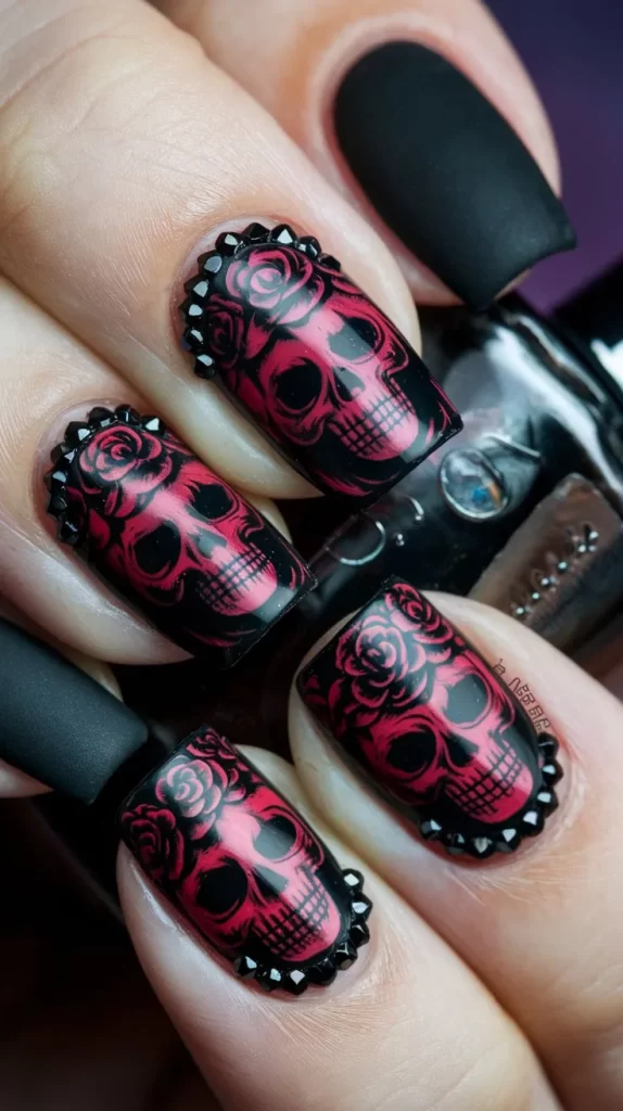 - Use a fine brush or stickers to add skull designs on one or two nails.