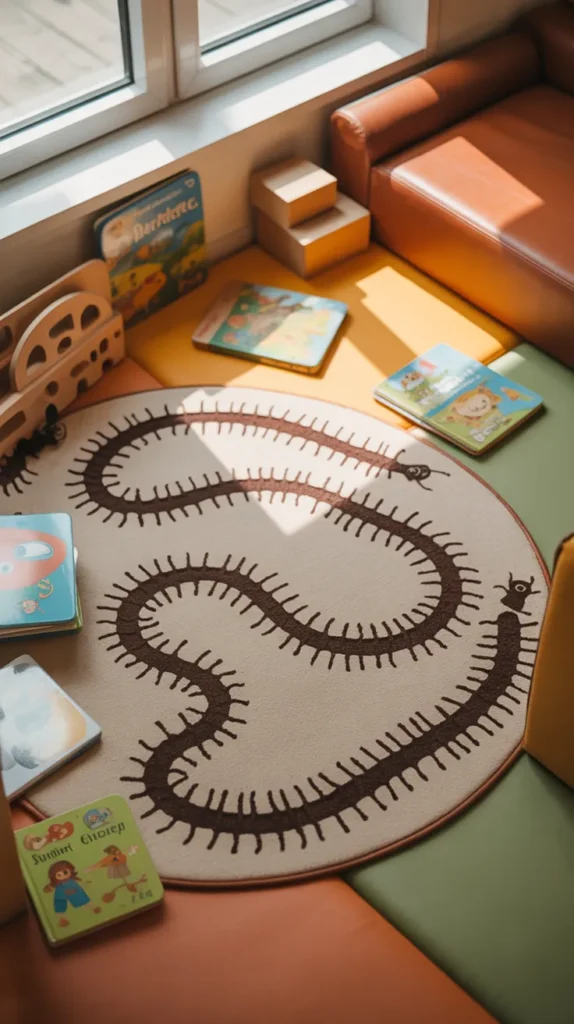 An ant trail round mat offers a fun and unusual bug theme for curious children. Brown, black, and green tones create an outdoor-inspired look that feels playful and educational. It can spark questions about nature and insects in a fun way.