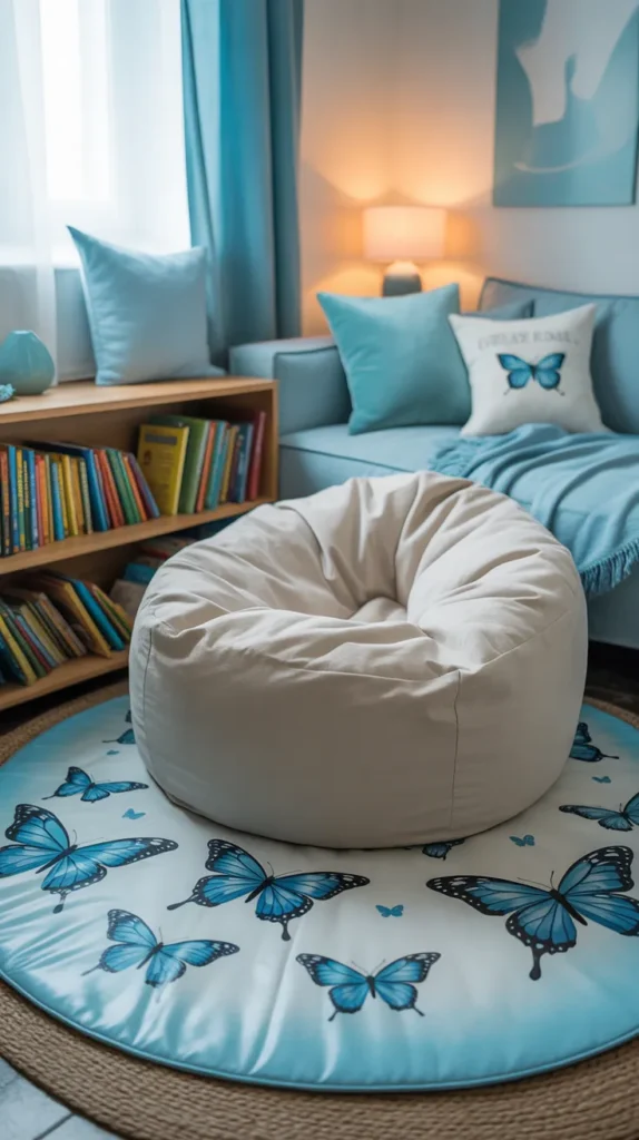 A blue butterfly mat brings peaceful color into reading spaces and quiet corners. Shades of sky blue and white help the room feel open and relaxing. Butterfly details add beauty without too much visual clutter.