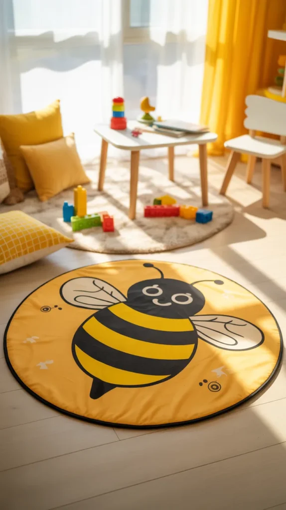 A bumblebee round mat adds happy yellow and black stripes that brighten any room. It works well in craft corners, playrooms, or nursery spaces where you want energy and warmth. The bee theme feels cheerful and modern, especially with white or light wood furniture.