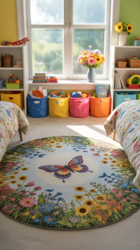 A butterfly meadow mat is great for shared sibling rooms because it feels bright and welcoming. Mixed colors, flowers, and butterflies help create a cheerful look that many children enjoy. It blends well with neutral furniture and colorful storage bins.