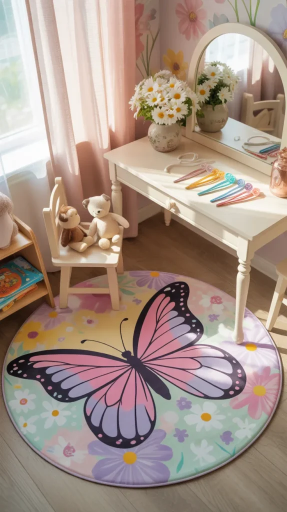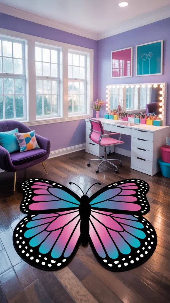 A butterfly wings mat gives a stylish look for older kids and tween bedrooms. Bold wing shapes in purple, teal, or pink feel trendy and creative. It offers a more grown-up version of butterfly decor while keeping the room fun.