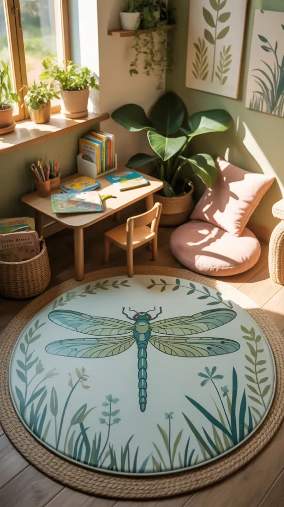 A dragonfly round mat brings graceful style into a child’s room. Blue, green, and silver tones create a fresh nature-inspired look that works in bedrooms or study corners. The long wing design feels unique and artistic while still playful enough for kids.