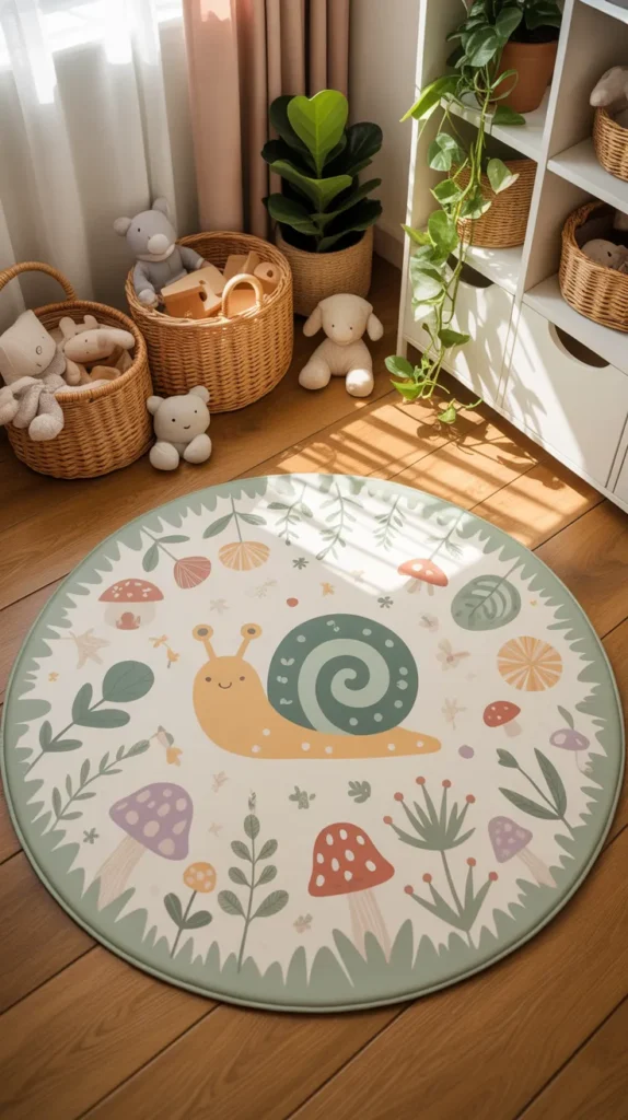 A snail garden mat adds slow and sweet charm to a child’s room. Spiral shell patterns and soft greens or browns create a playful nature look. It works well in nurseries, playrooms, or rooms with plant decor.