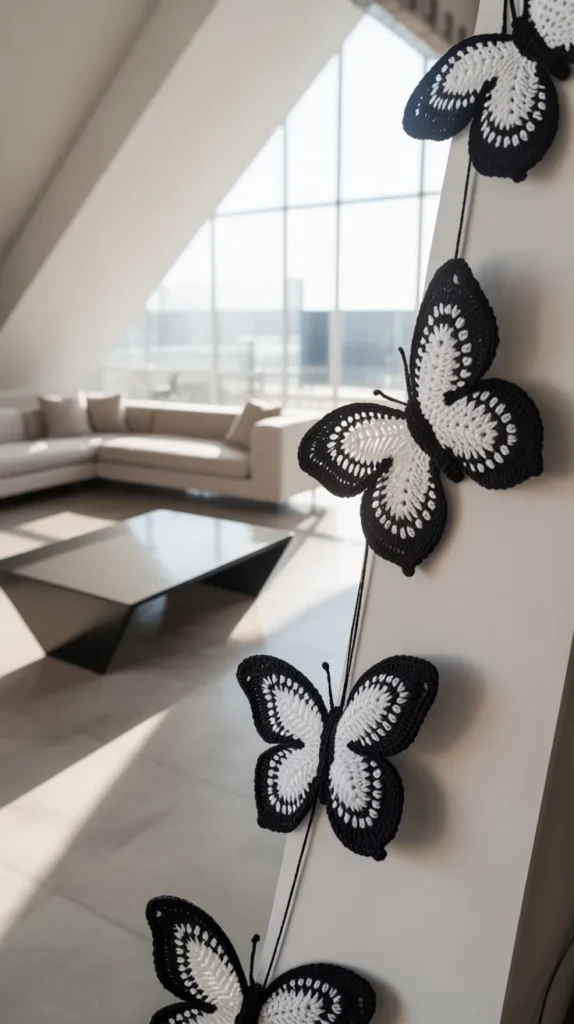 A black and white butterfly garland offers a clean modern style. Monochrome butterflies create contrast and fit well in minimalist homes, office spaces, or contemporary bedrooms.