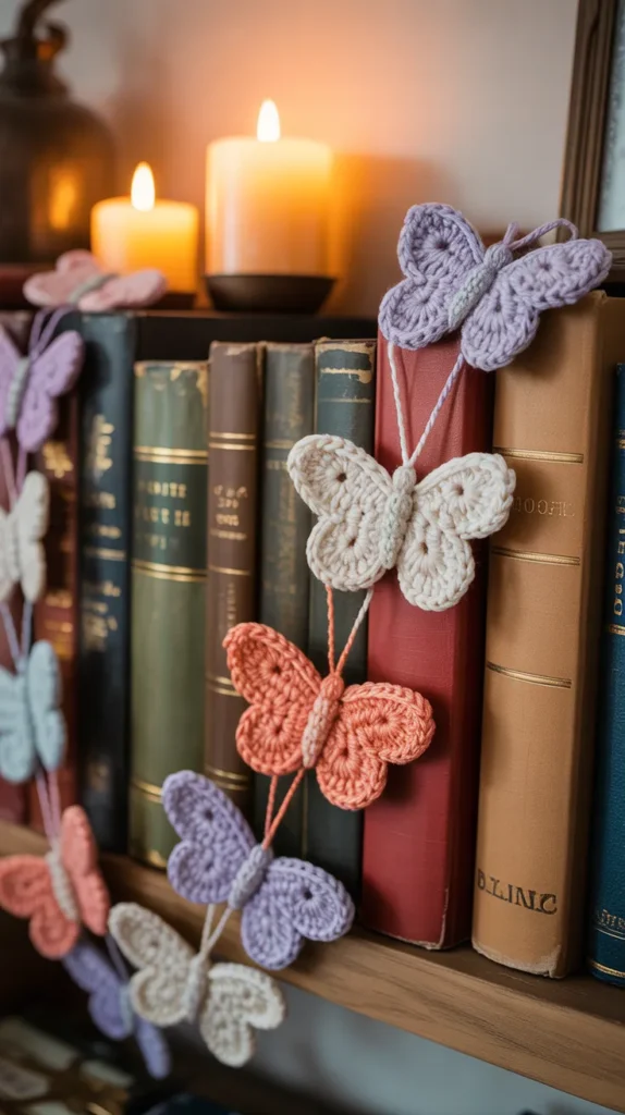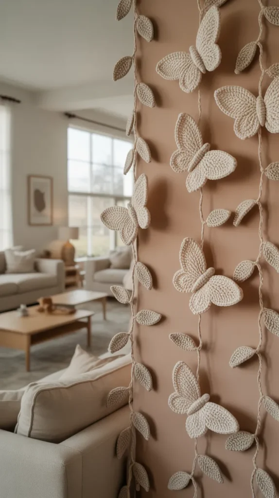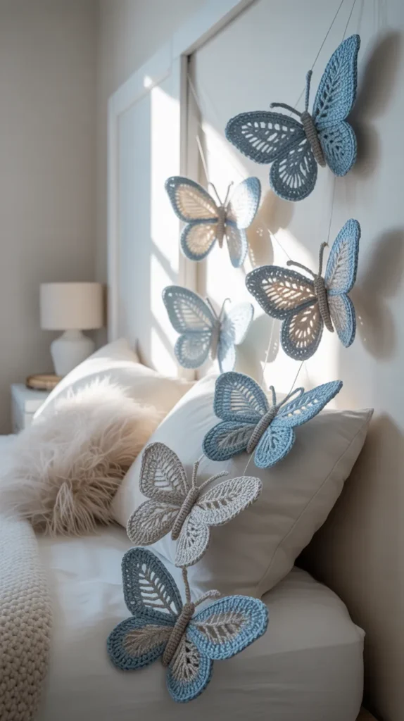 A boho butterfly tassel garland combines crochet butterflies with hanging tassels for extra texture and movement. This style looks amazing with woven baskets, macrame decor, and natural wood furniture. It gives walls a relaxed handmade feel.