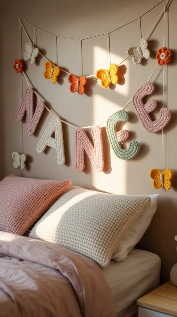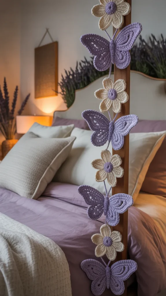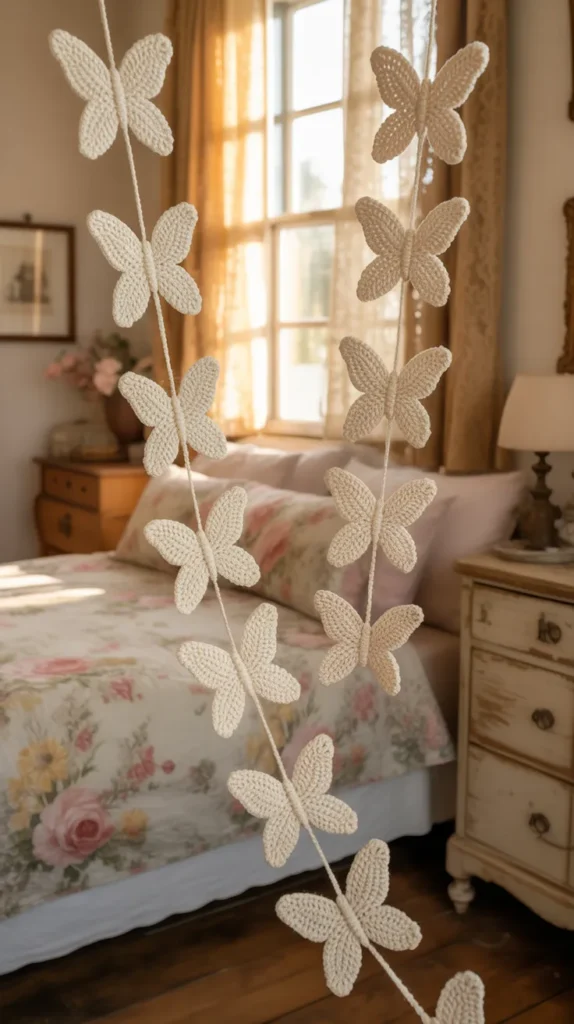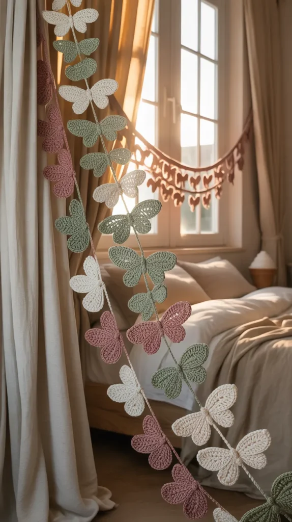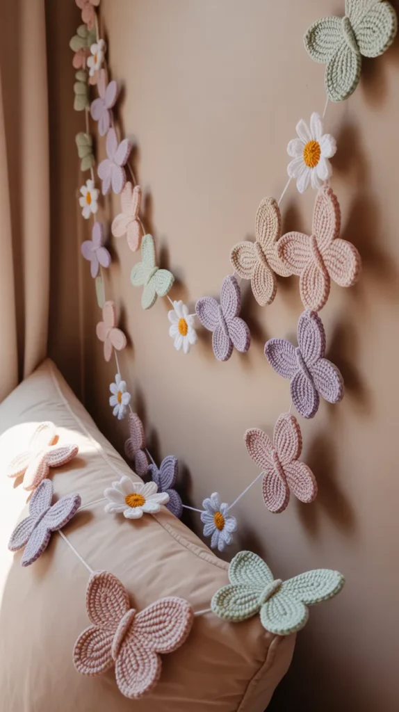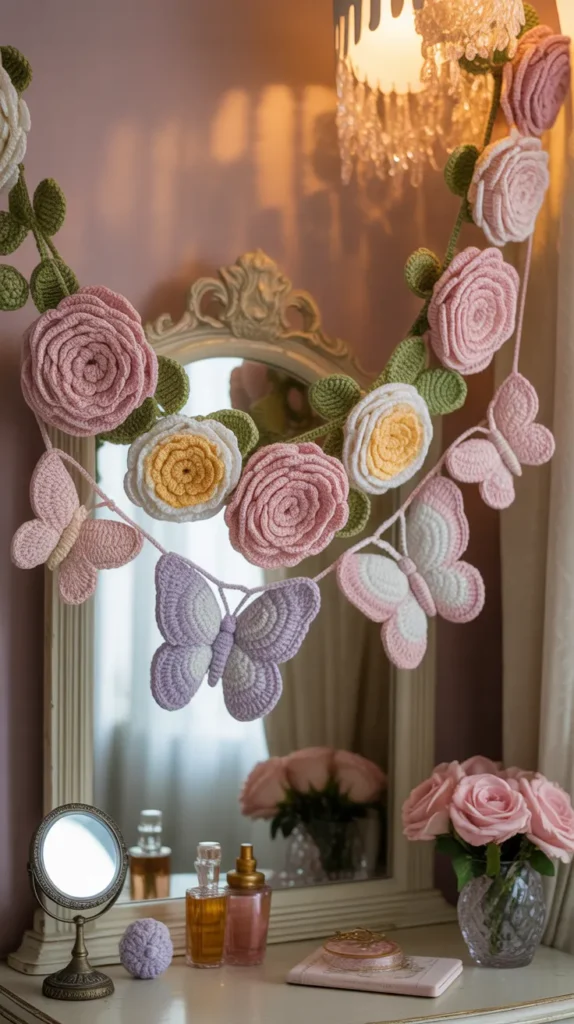 A butterfly and rose garland combines delicate butterflies with crochet roses for a romantic garden look. This style is perfect for bedrooms, vanity spaces, or feminine room decor themes.