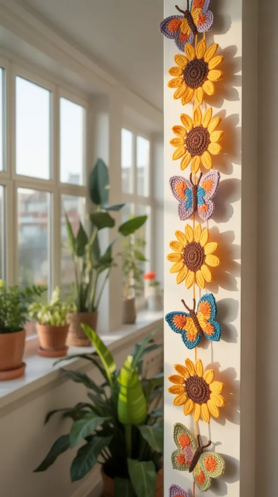 A butterfly and sunflower garland brings bright summer energy into the room. Yellow crochet sunflowers with butterflies create a happy garden theme that feels fresh and welcoming. This style is perfect for kitchens, craft rooms, or sunny bedrooms.