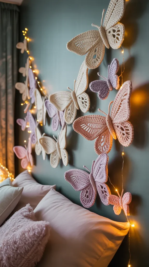 A fairy light butterfly garland wraps soft string lights around crochet butterflies and flowers. The gentle glow makes walls feel magical in the evening and cozy at night.