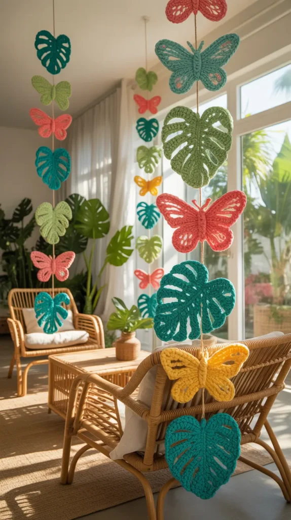 A tropical butterfly leaf garland uses bright butterflies with large green crochet leaves. It creates a lively garden wall style inspired by warm weather and nature themes.
