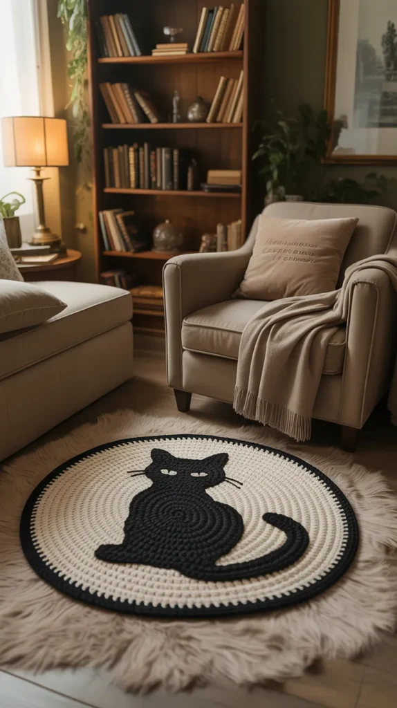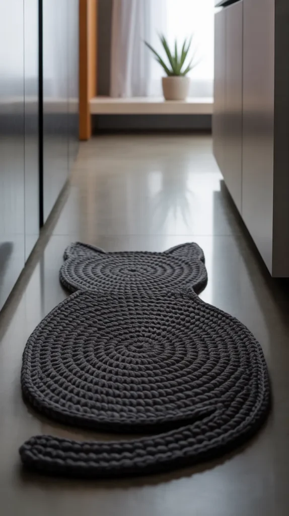 A black cat crochet mat adds bold charm to modern interiors. Black, white, and gray tones create a stylish contrast that works beautifully in minimalist homes. The cat silhouette gives personality while keeping the room sleek and uncluttered.