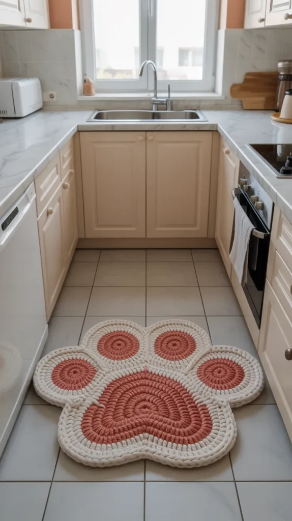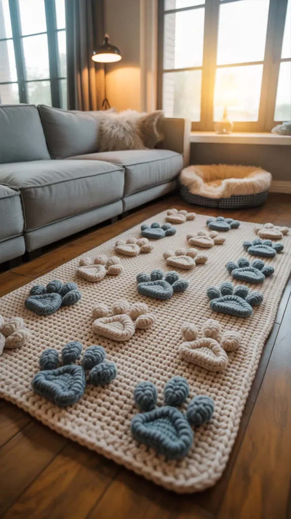 A cat paw crochet mat is perfect for compact homes and apartments. The simple paw design adds charm without making the room feel crowded. Choose soft grays, whites, or pastel tones for a light and airy look.