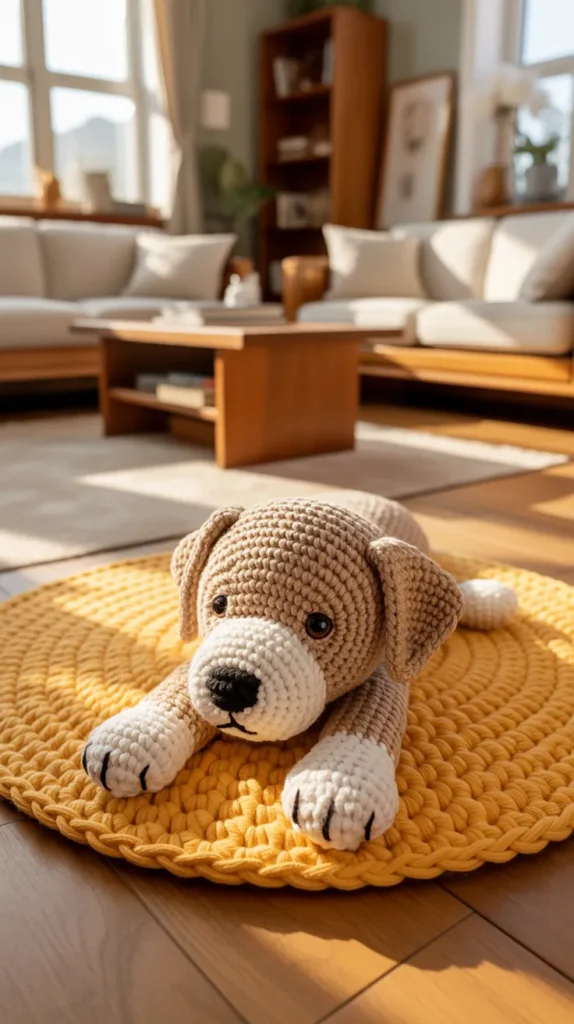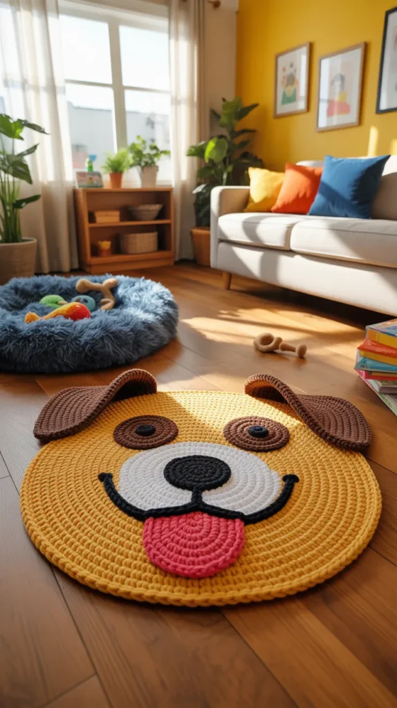 A golden puppy crochet mat adds sunny warmth to homes with beige, cream, or wood tones. The friendly puppy face feels welcoming and works well in living rooms, nurseries, or pet corners.