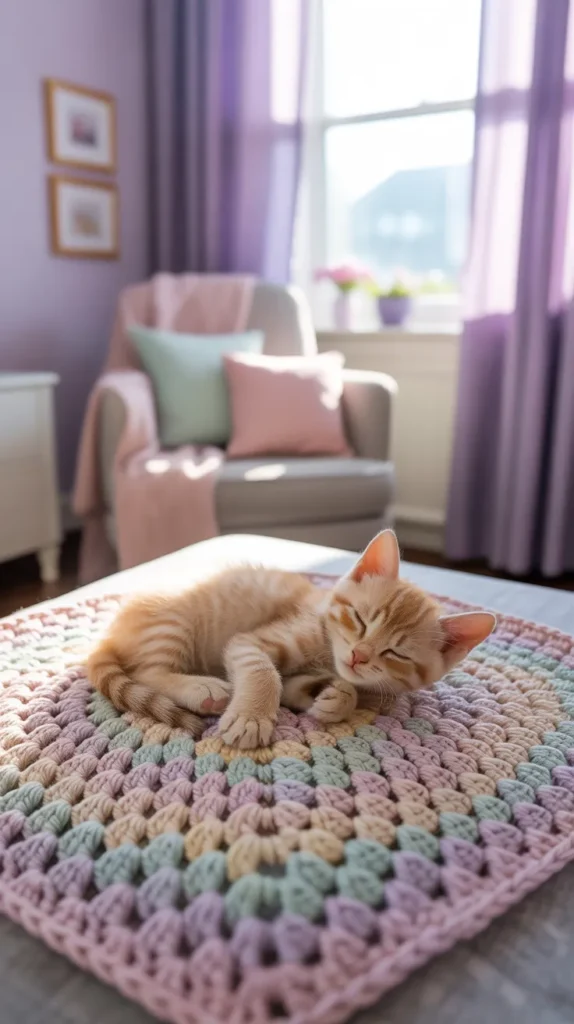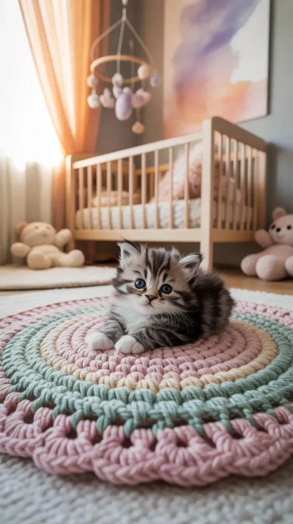 A fluffy kitten crochet mat adds softness and sweetness to nurseries or toddler rooms. Cream, blush, gray, or light peach colors help create a gentle mood. The kitten design feels playful but calm.